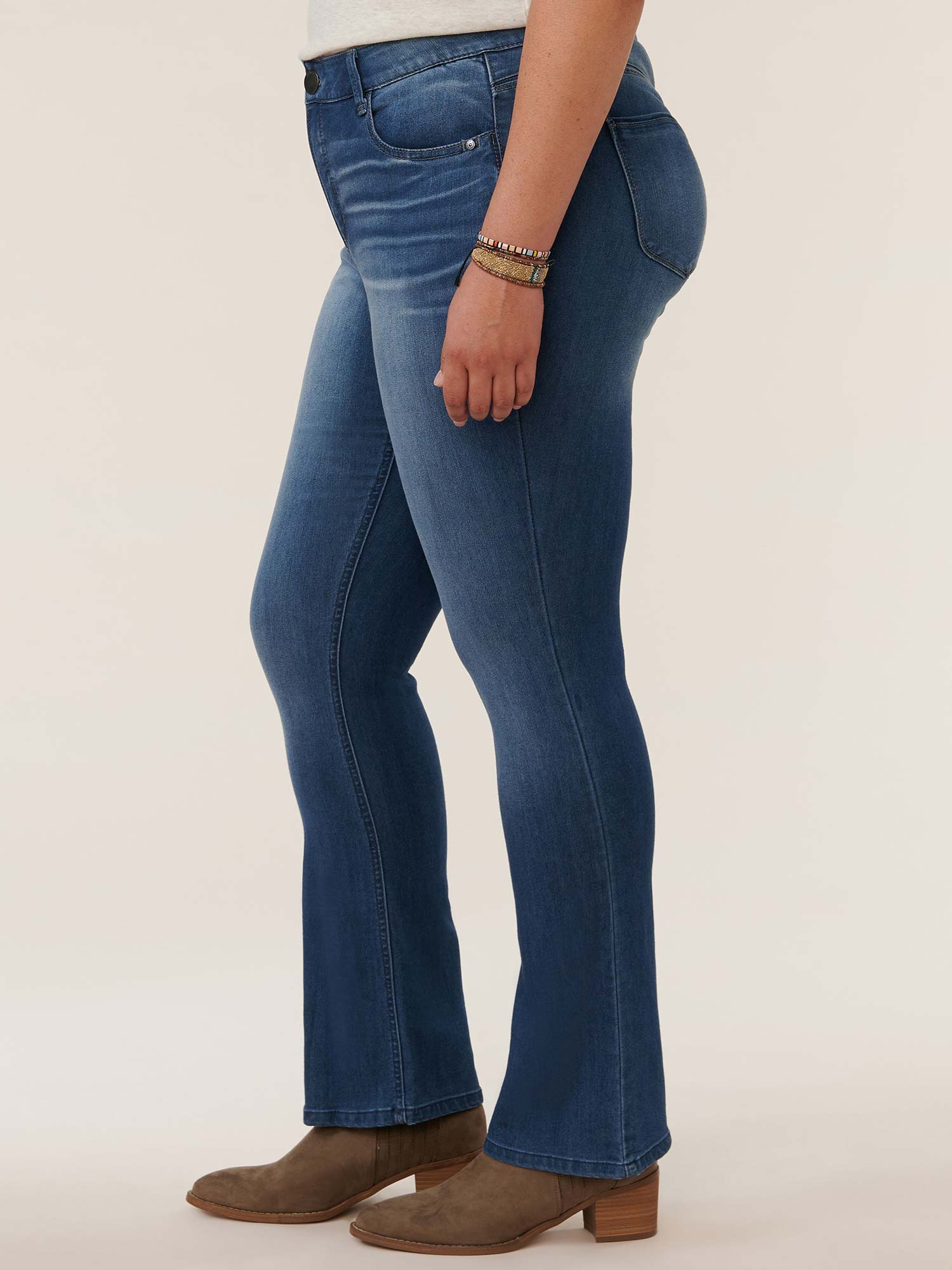 Designed with our signature mold-and-hold "Ab"solution fit technology that smooths your tummy with slimming power mesh panels, these blue wash itty bitty boot jeans in plus sizing will be your new go-to pair for all-day comfortable wear. Constructed with stretchy denim, hand sanding, and whiskering for added style and comfort.
