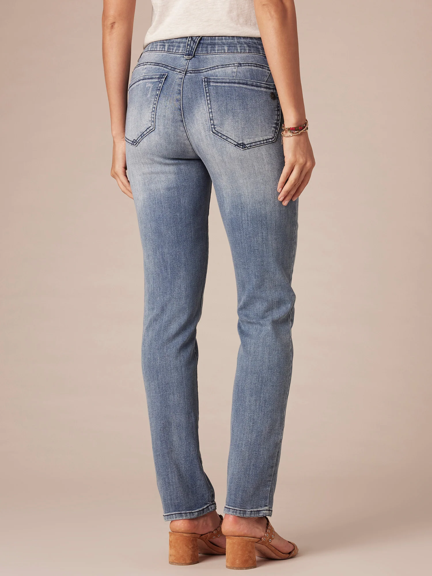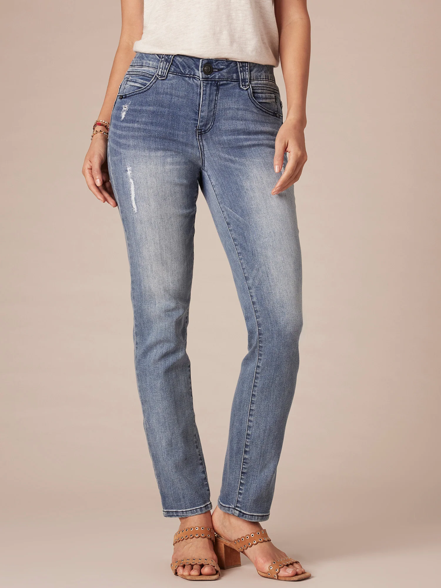 Lift your confidence and booty with these mid-blue vintage wash denim straight-leg jeans in petite sizing. The subtle destruction, hand sanding, and whiskering details give this pair of jeans a chic lived-in look. Designed with our figure-flattering "Ab"solution fit technology that smooths your tummy with interior power mesh panels.