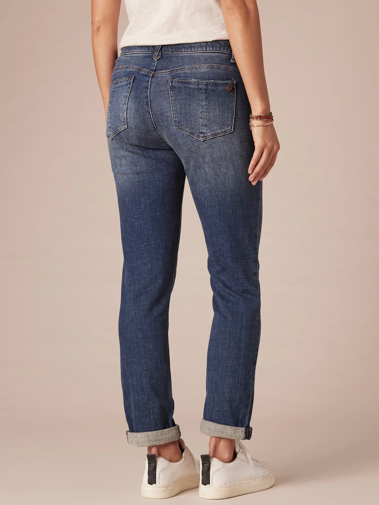 Weekend-ready farmer's market to brunch jeans, our "Ab"solution girlfriend is all about comfort that never sacrifices style. Made from premium authentic denim in a luxe cotton-spandex blend and designed with our exclusive "Ab"solution fit technology built-in power mesh panels for total tummy-control and a stretchy elastic no-gap waistband. Finished with dollops of destruction, hand sanding, and whiskering detail. Boyfriend style you can wear these cuffed or uncuffed at the leg opening.