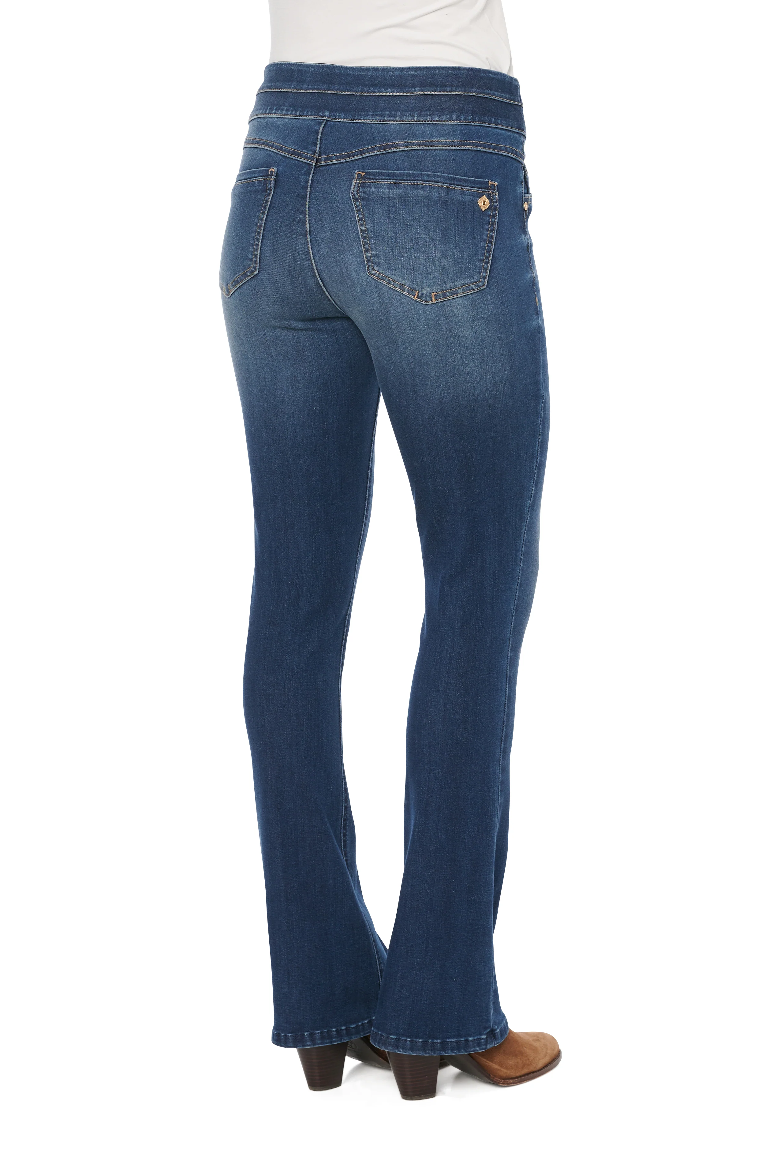 Slip into comfort and style with these high-waisted "Ab"solution itty bitty boot gliders featuring a chic blue wash, faux fly front, and a stretchy pull-on no-gap waist that prevents unwanted gapping.