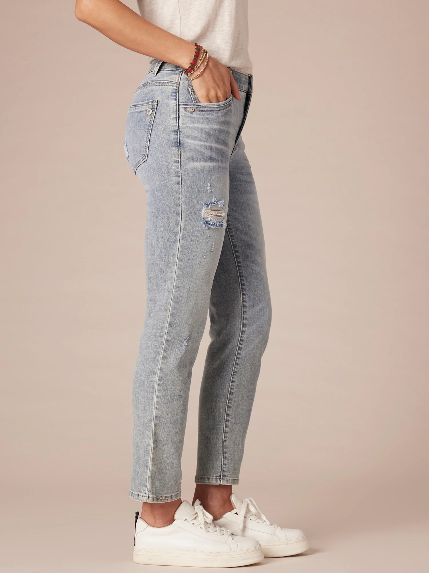 Keep cool with these petite high-rise skinny jeans featured in a light blue vintage wash crafted with COOLMAX denim. They offer an on-trend lived-in look with whiskering, hand sanding, and distressed details. Designed with our mold-and-hold "Ab"solution fit technology that flattens your tummy with interior power mesh panels and prevents gapping with a no-gap elastic waistband.
