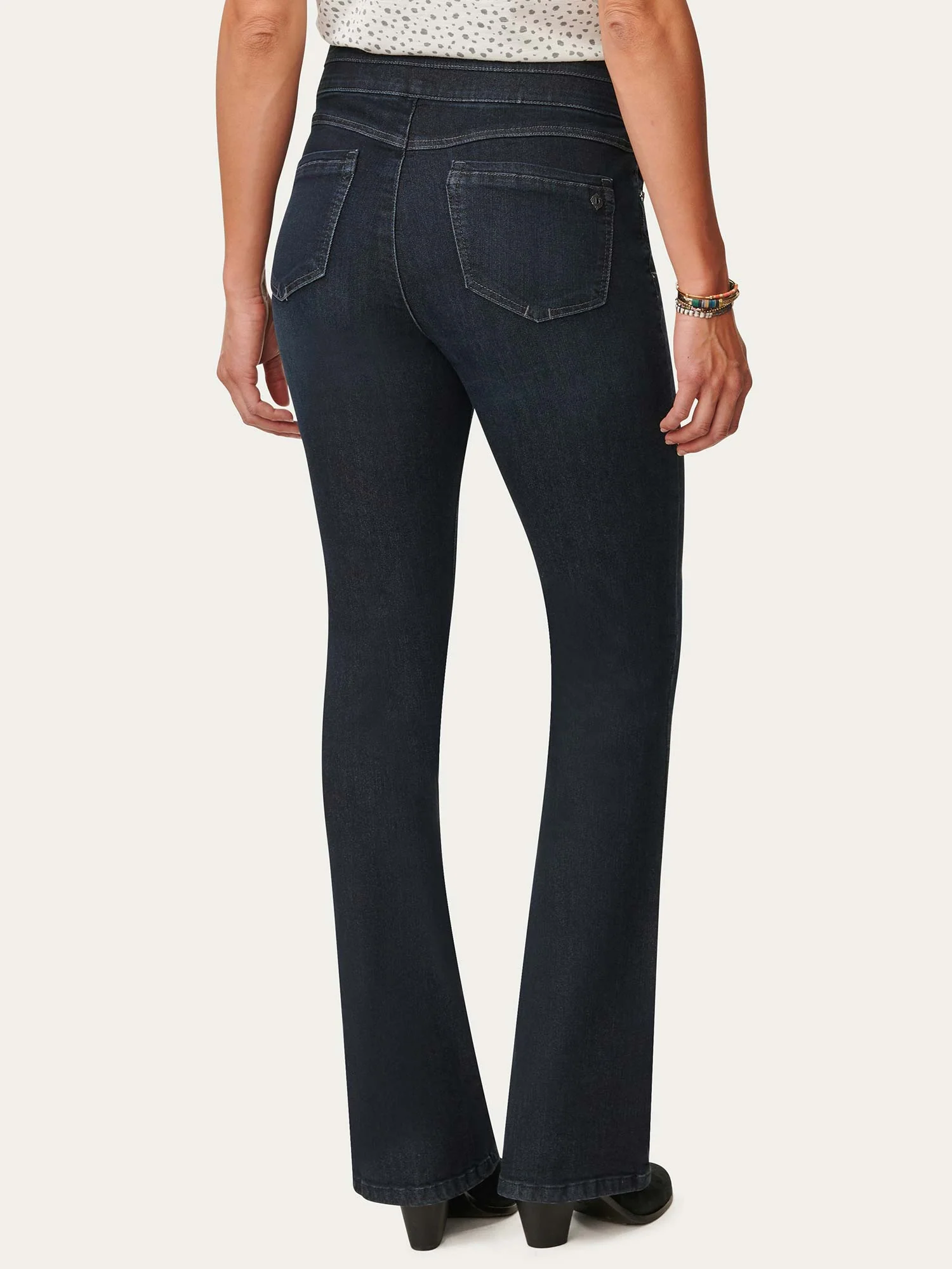 Elevate your everyday look with the sleek dark indigo wash of these high-rise itty bitty boot gliders. Designed with a stretchy no-gap pull-on waistband and our signature "Ab"solution fit technology that flattens your tummy with interior power mesh panels for all-day comfortable wear.