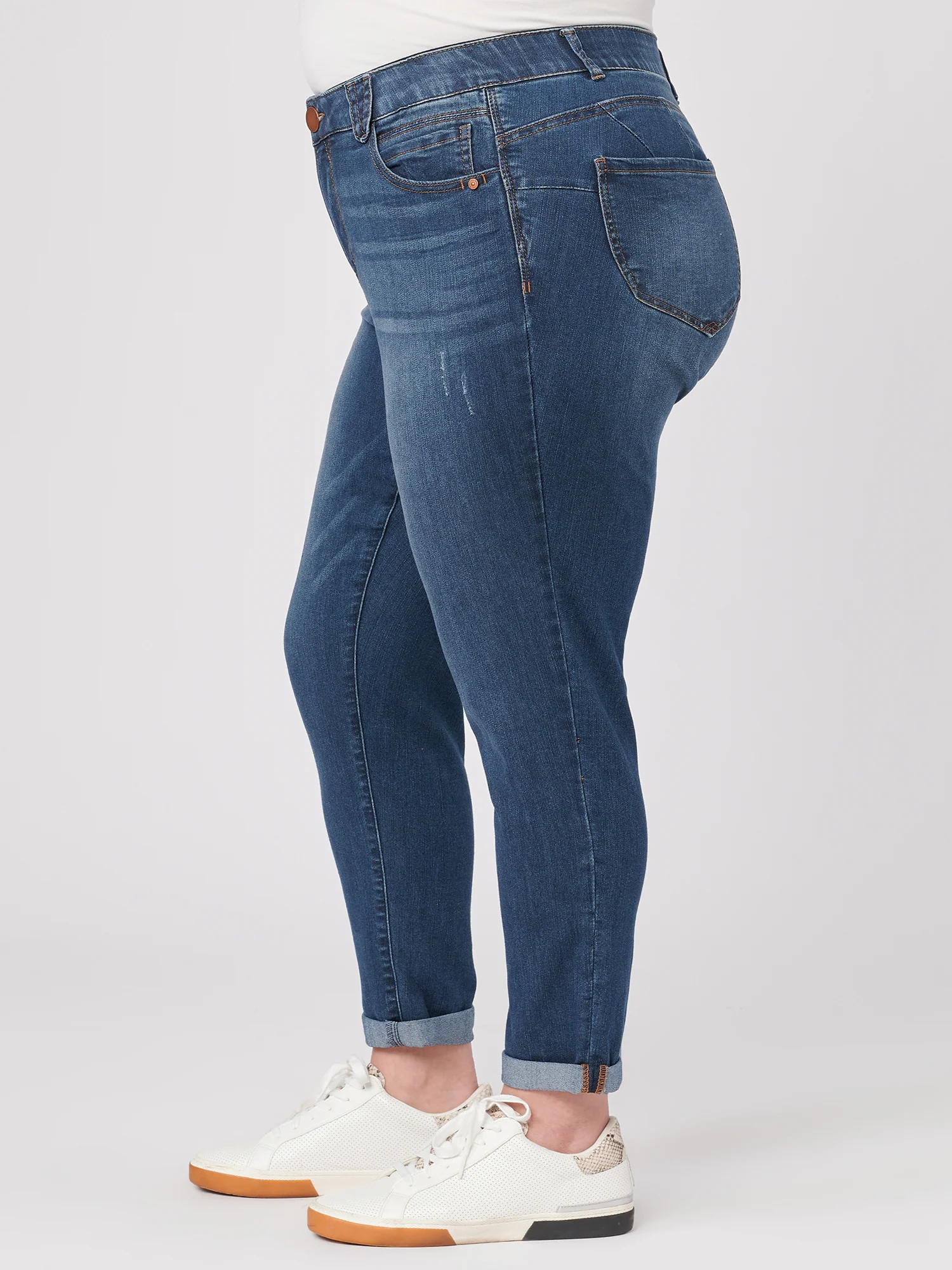 A sleek indigo wash elevates the curve-hugging fit of these ankle-grazing plus-size skinnies with whiskering, delicate destruction, and a perfectly faded finish. Made from exceptionally soft luxe touch stretch denim and designed with our unique "Ab"solution fit technology interior tummy-smoothing power mesh panels and a no-gap elastic waistband that comfortably shapes. Booty lift included! Wear these cuffed or uncuffed.