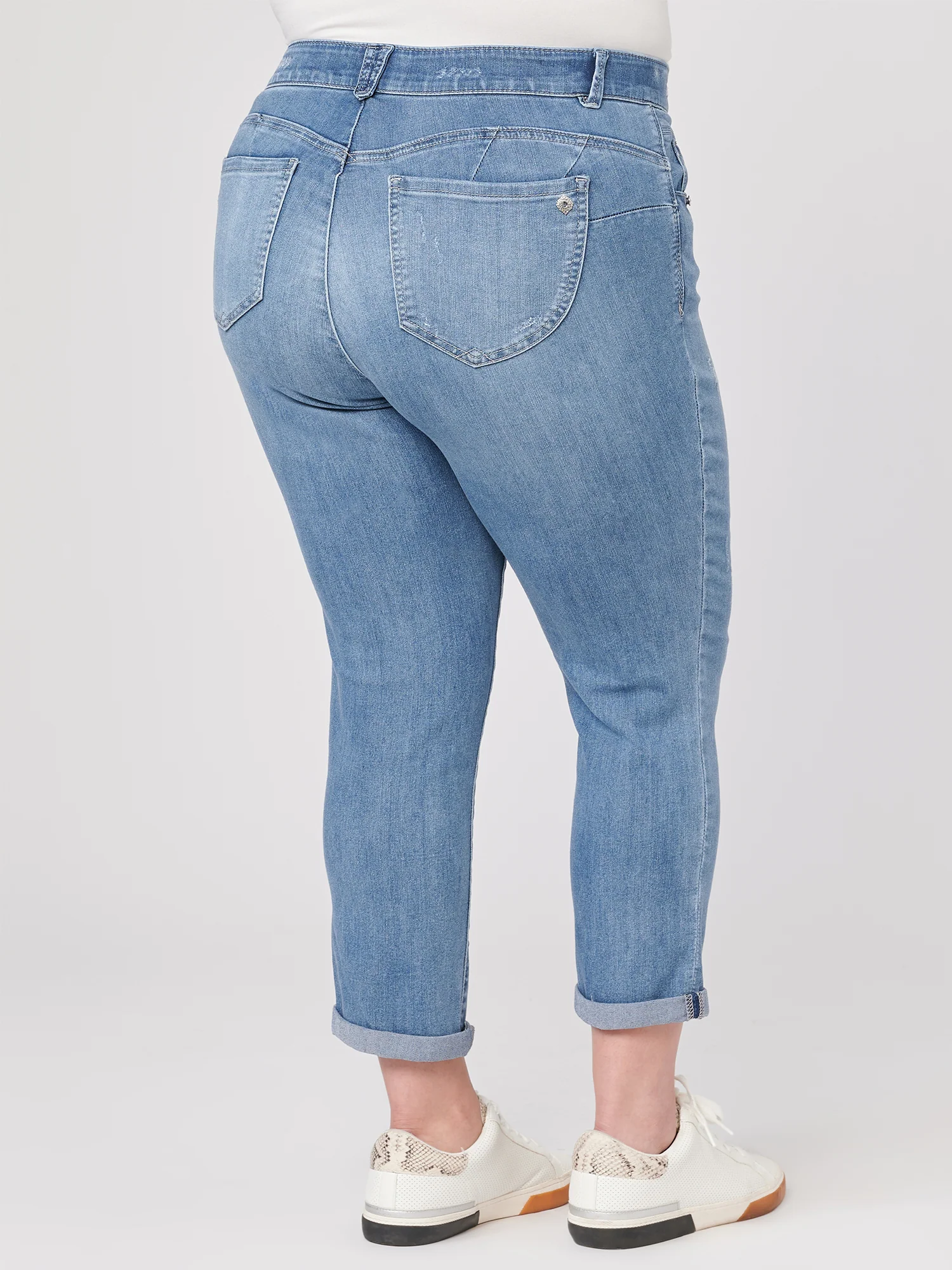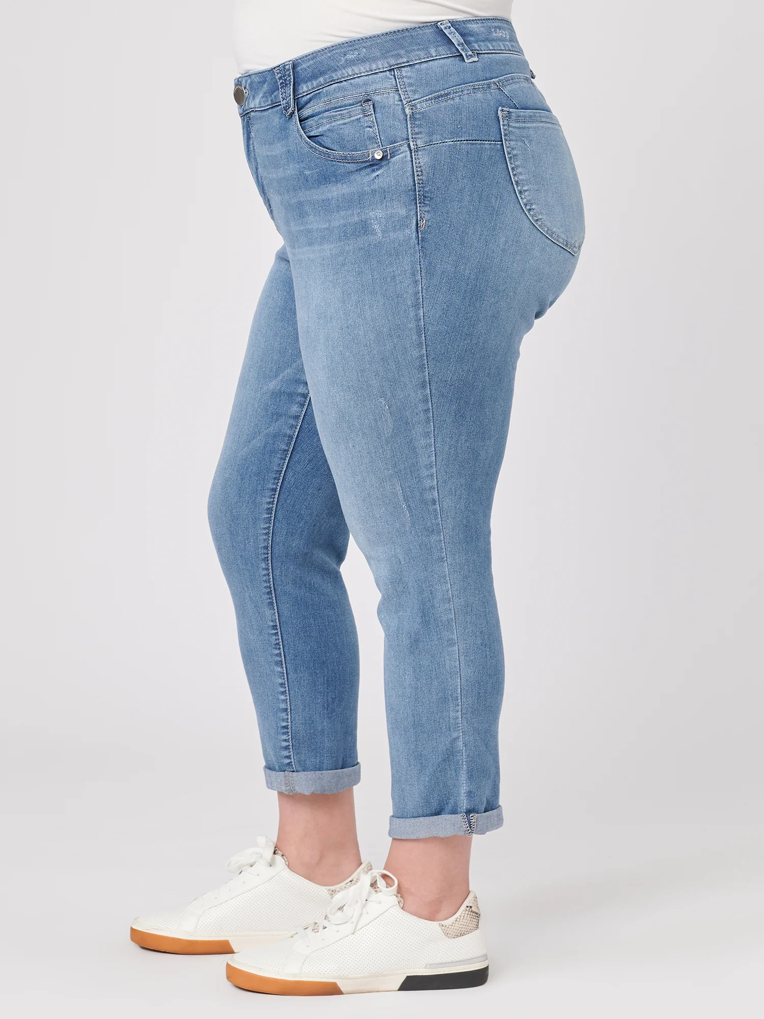 An artisanal light blue wash and hand sanding add an effortless weekend-ready feel to these "Ab"solution plus-size ankle skimmer jeans with an ankle-grazing length. Crafted from premium soft-stretch denim with 2% spandex for added comfort and stretch. These denim skinnies are constructed with our built-in power mesh panels, stretchy no-gap elastic waistband, and booty lift fit technology. Style these cuffed or uncuffed.