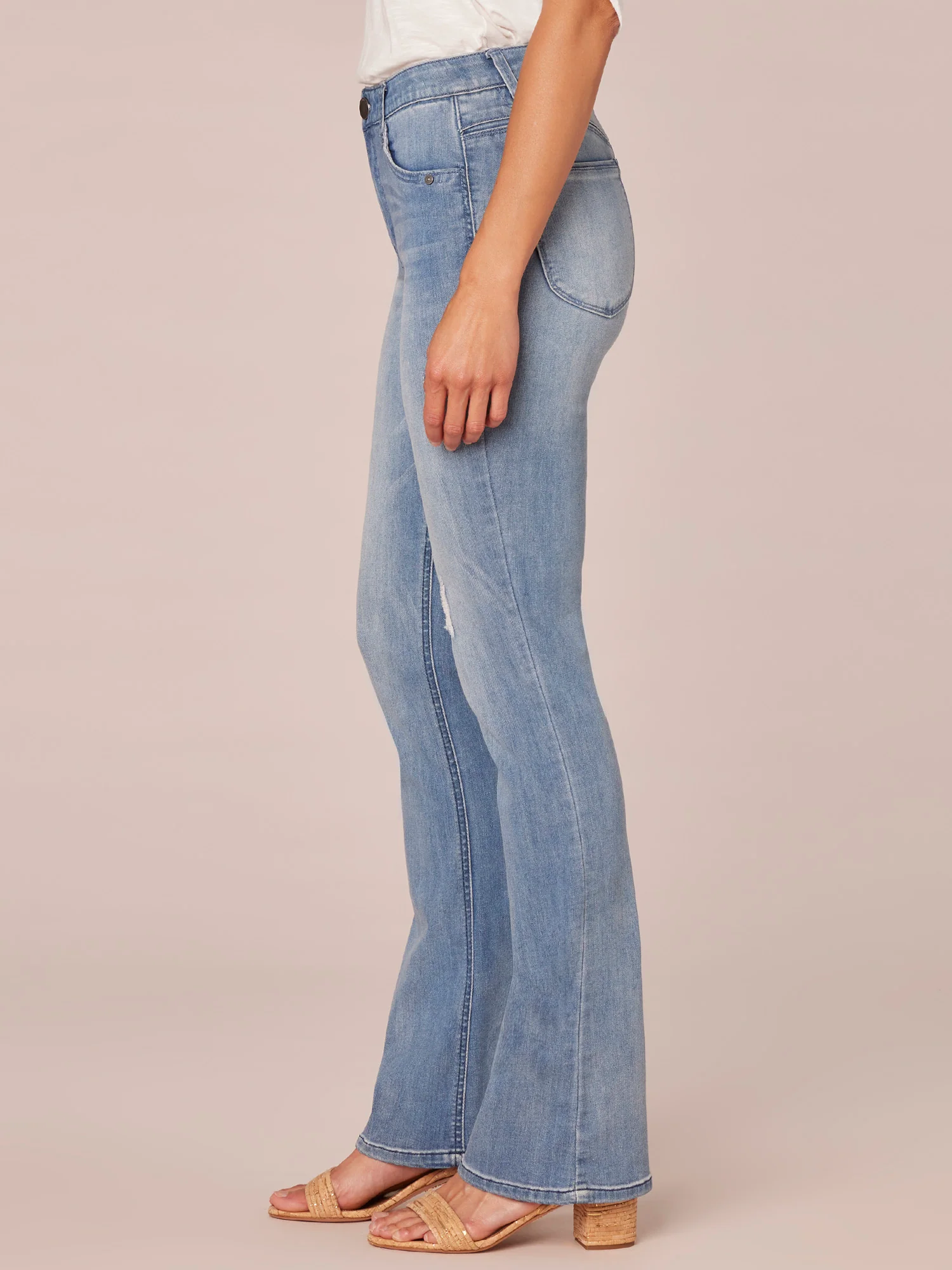 These weekend-ready petite high-rise Itty Bitty Boot jeans offer a well-worn look with a chic light blue vintage wash, fading, and subtle distressed details. Designed with soft stretchy denim and our figure-flattering "Ab"solution fit technology that flattens your tummy with interior slimming power mesh panels.