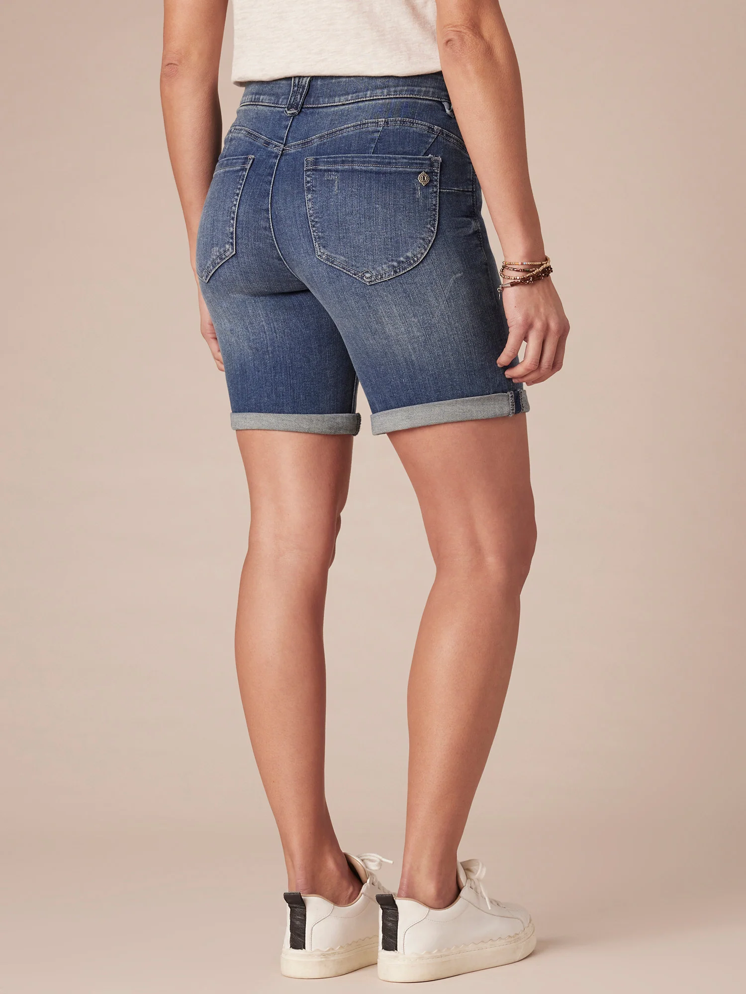 These seven-inch long shorts in a classic true blue wash will quickly become your sunny weather pair with everything bottoms! Featuring an adjustable roll cuff so you can wear these cuffed or uncuffed at the hem and Democracy's "Ab"solution fit technology that molds, holds, and "boosts your assets."