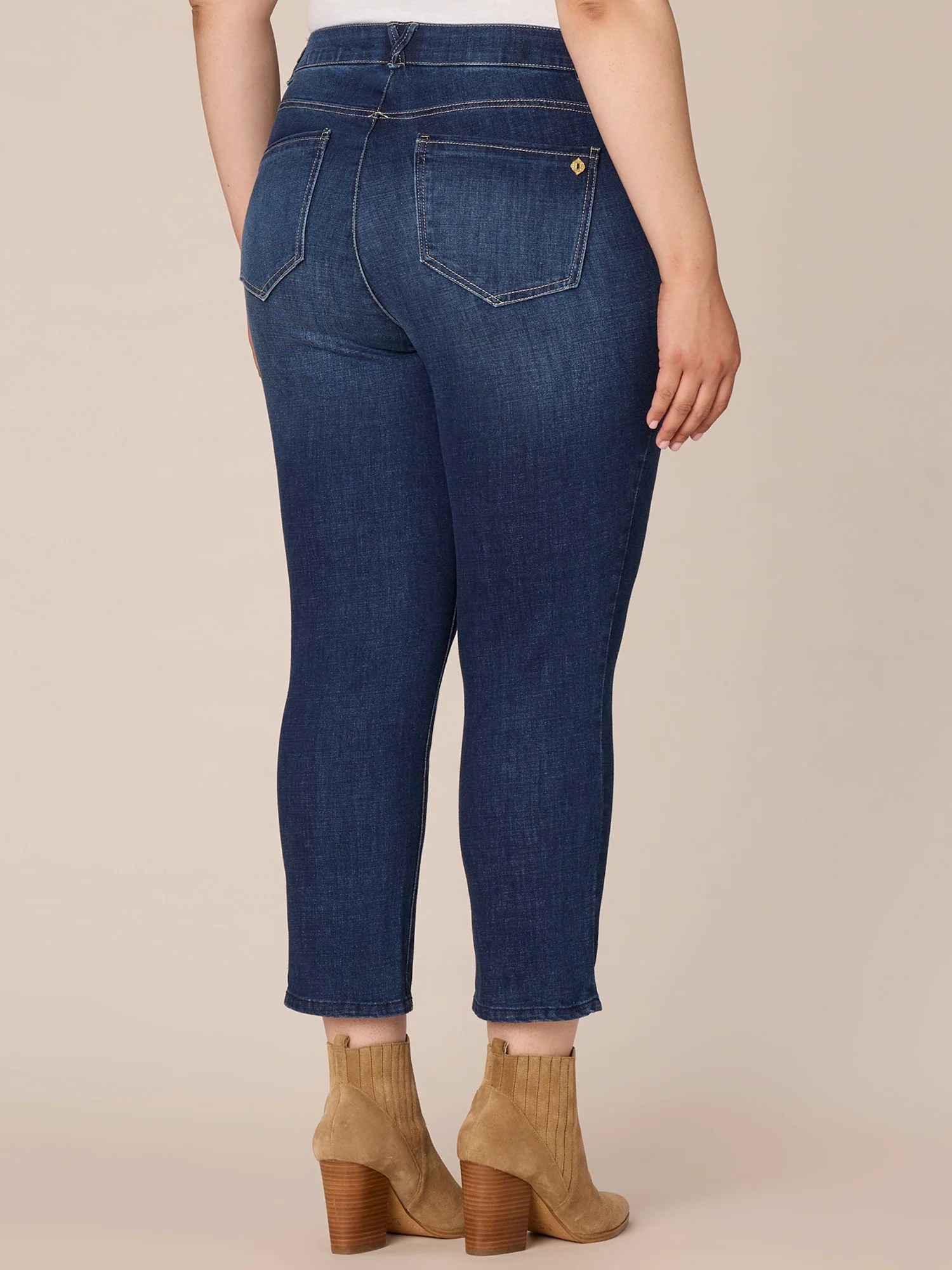 Meet your new weekend denim: the Ab solution Skinny in plus sizing and a timeless indigo wash. It features a high rise waist, subtle fading details, and our signature fit technology for unparalleled comfort and a mold-and-hold fit. Look and feel your best with a hidden no gap waistband, interior power mesh panels, and a sweetheart shaped yoke for a booty lift effect.