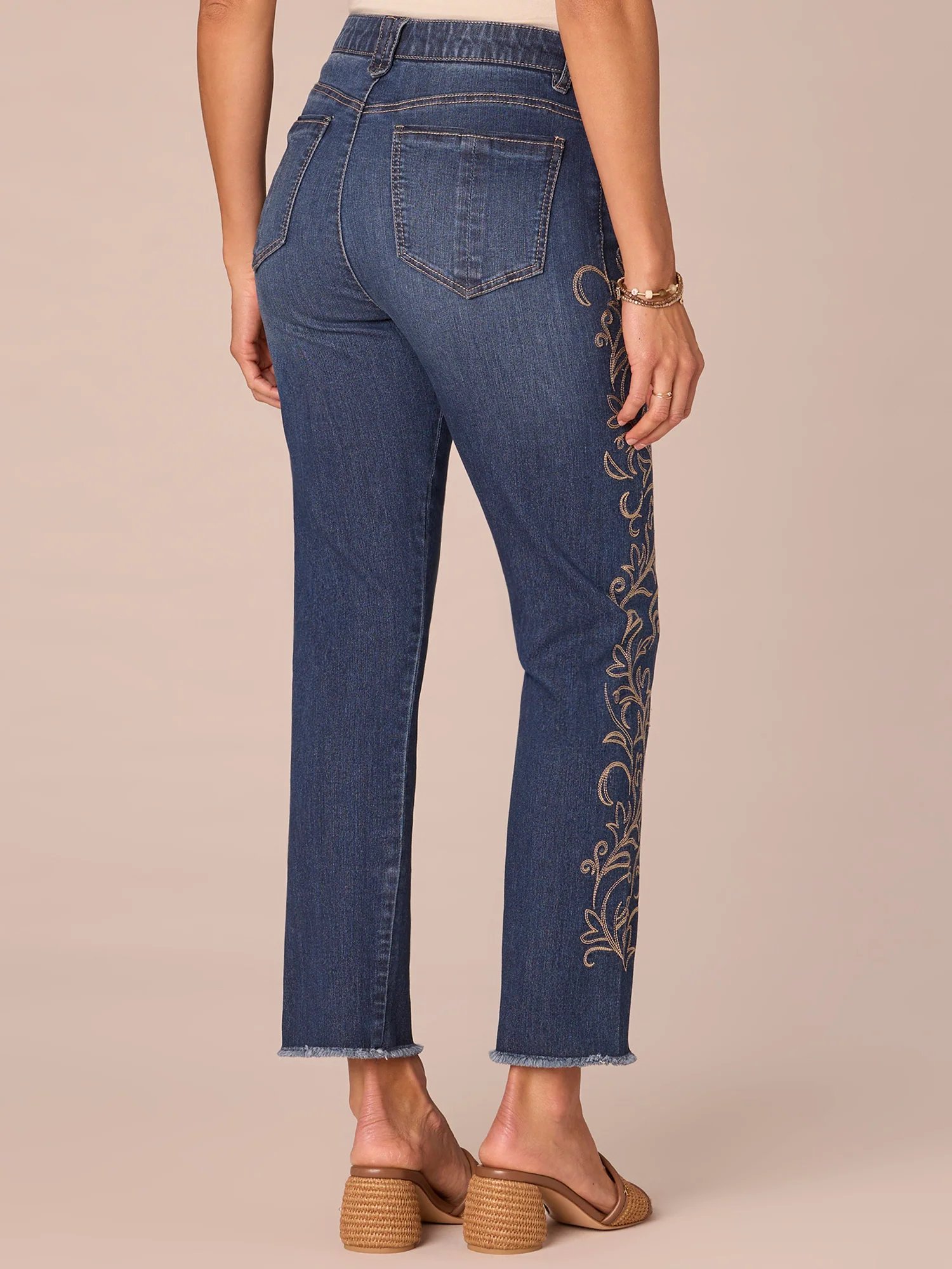 Upgrade your blue jeans with this showstopper. The Ab solution Slim Straight jean has a high rise waist, seamless design, chic western embroidery, and a slightly edgy fray hem, as well as our signature fit technology for your most flattering silhouette ever.