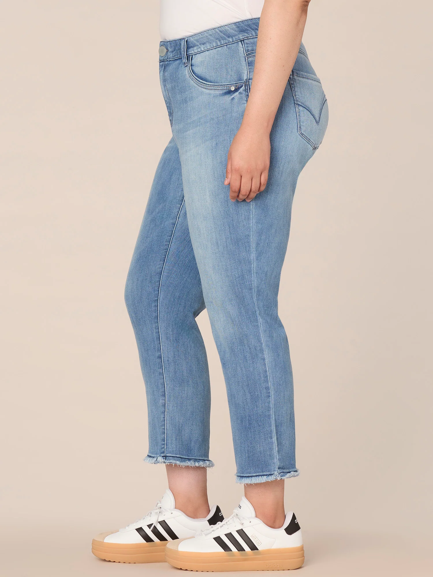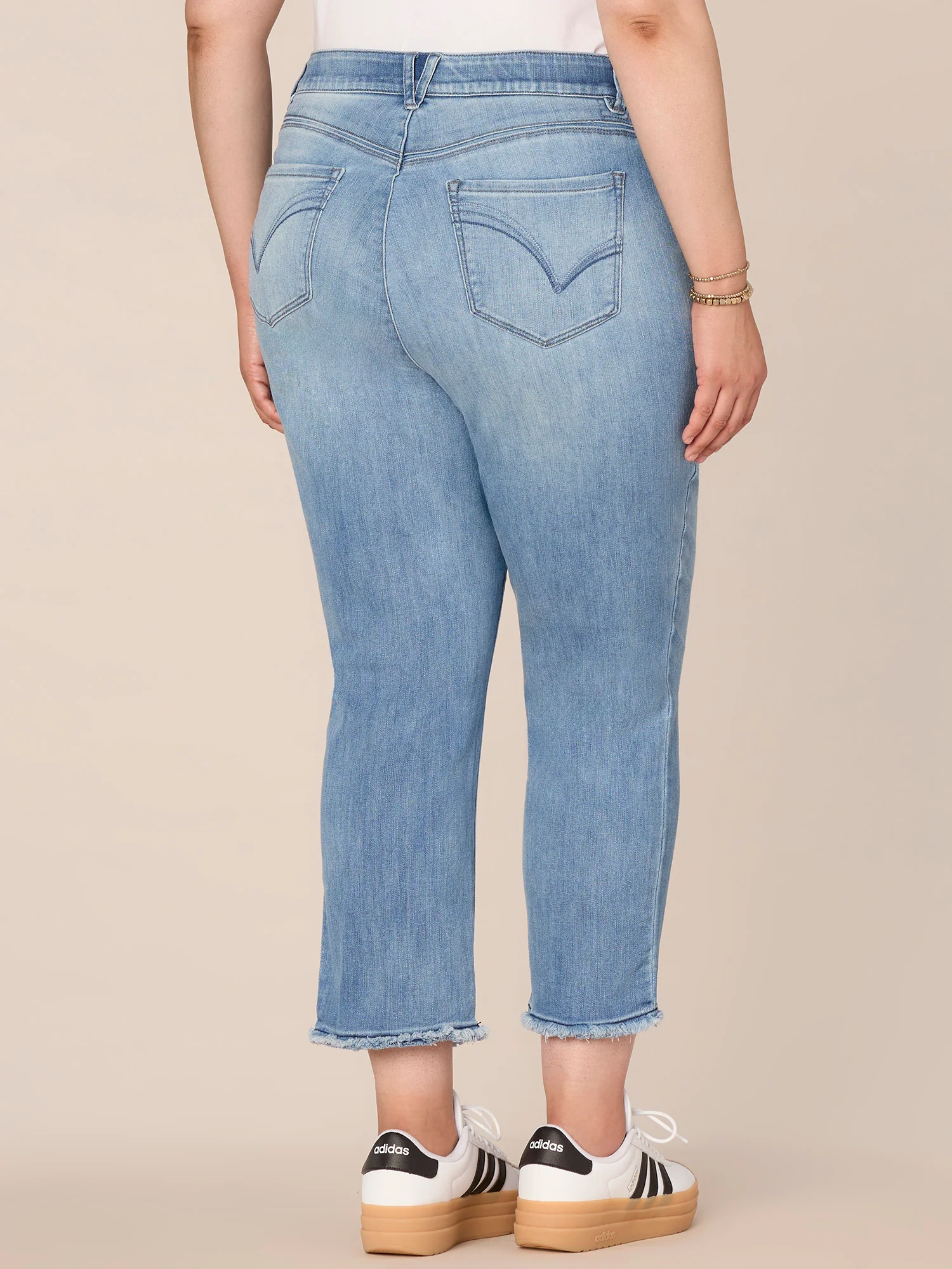 Conquer your day with these classic Ab solution Slim Straight jeans in plus sizing, featuring a high rise waist, subtle fading details, embroidered cascading D back pockets, and a clean finish fray hem. A premium, flattering jean created to fit a woman s natural curves, thanks to our signature fit technology with a hidden no gap elastic waistband, power mesh panels, and strategically placed back pockets for a flattering booty lift effect.
