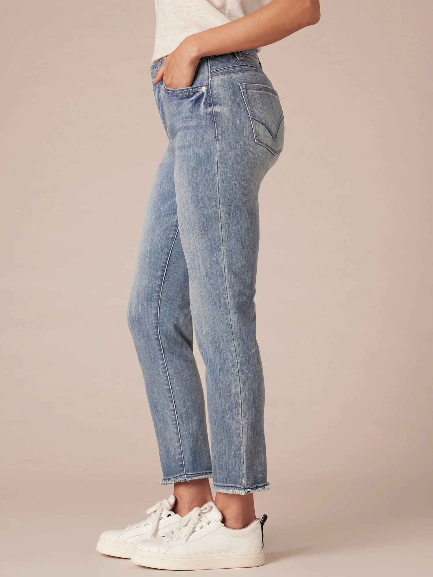 If your favorite denim bottoms are looking a little worse for wear, it might be time to find a new everyday pair. Let us introduce you to the Ab solution Slim Straight jean, a timeless style that elevates even your most basic outfits with its chic design details and signature fit technology. They feature a five-pocket styling, high rise waist, clean finish fray hem for a touch of edge, and an embroidered cascading D on the back pockets.