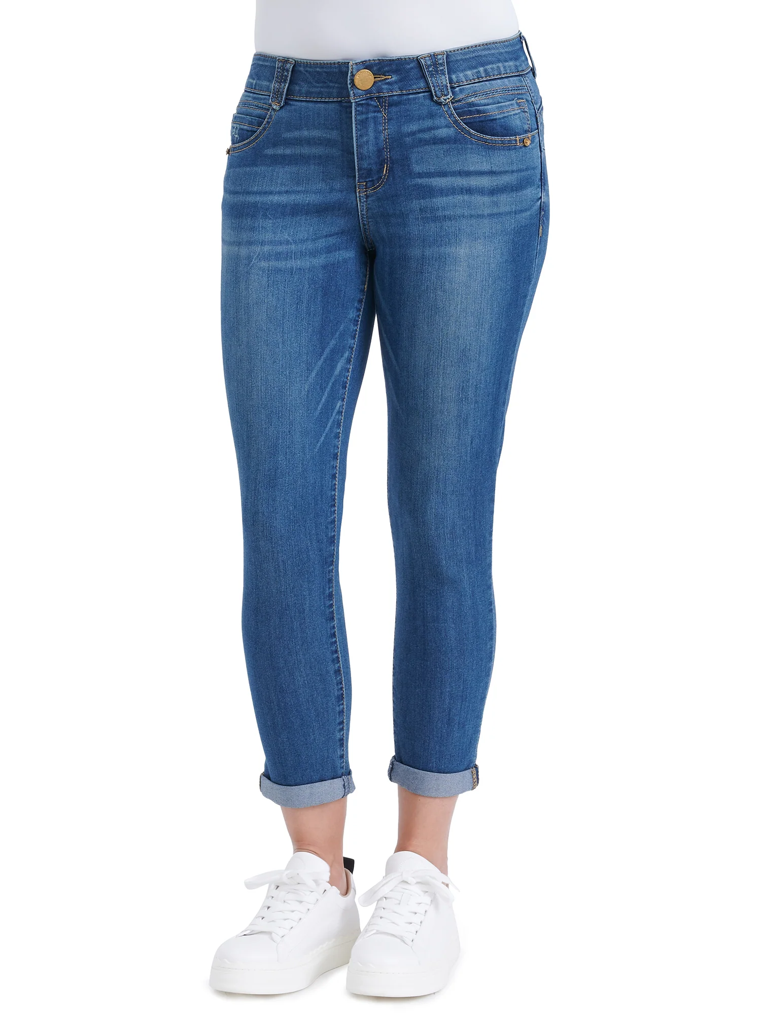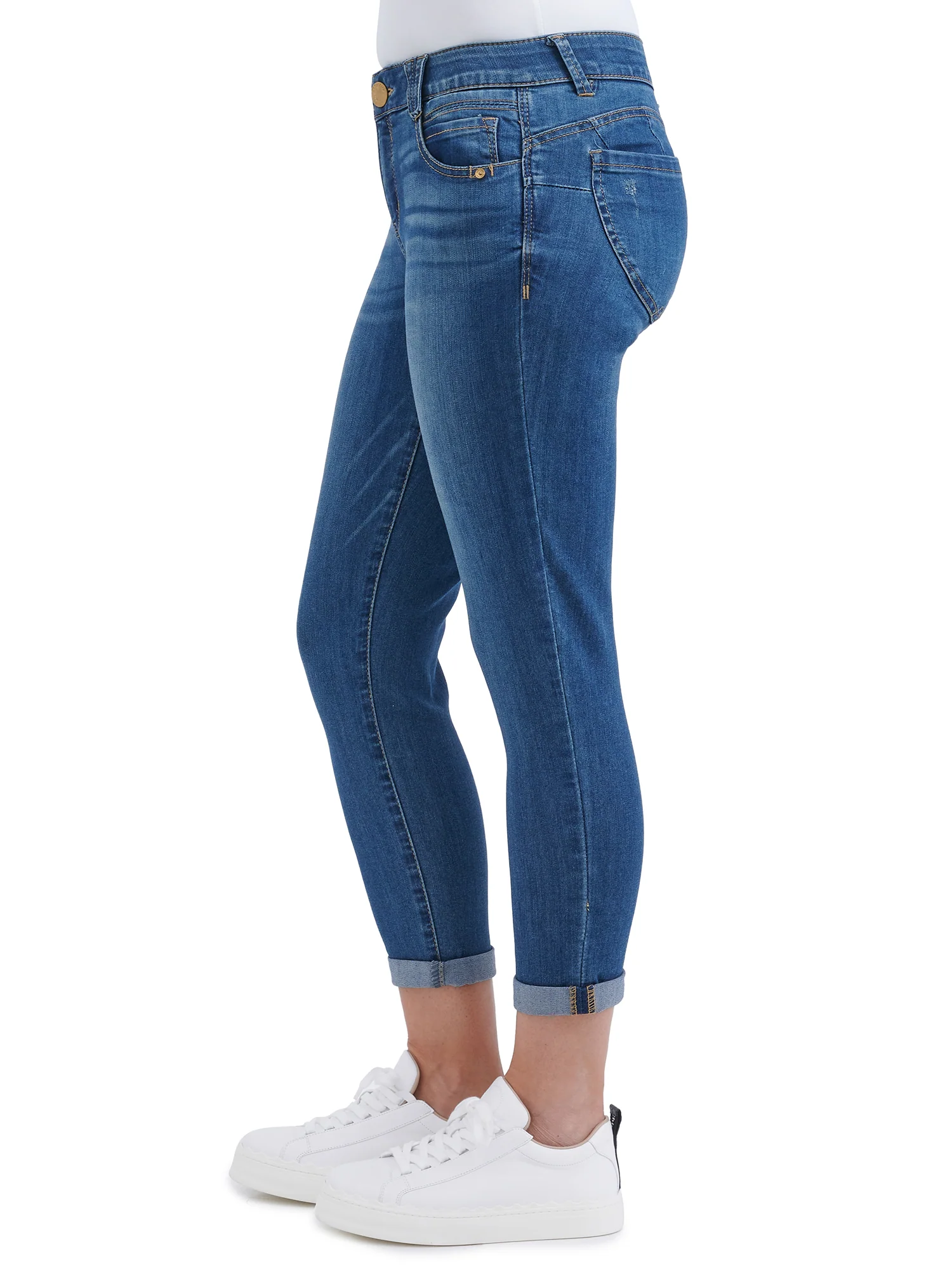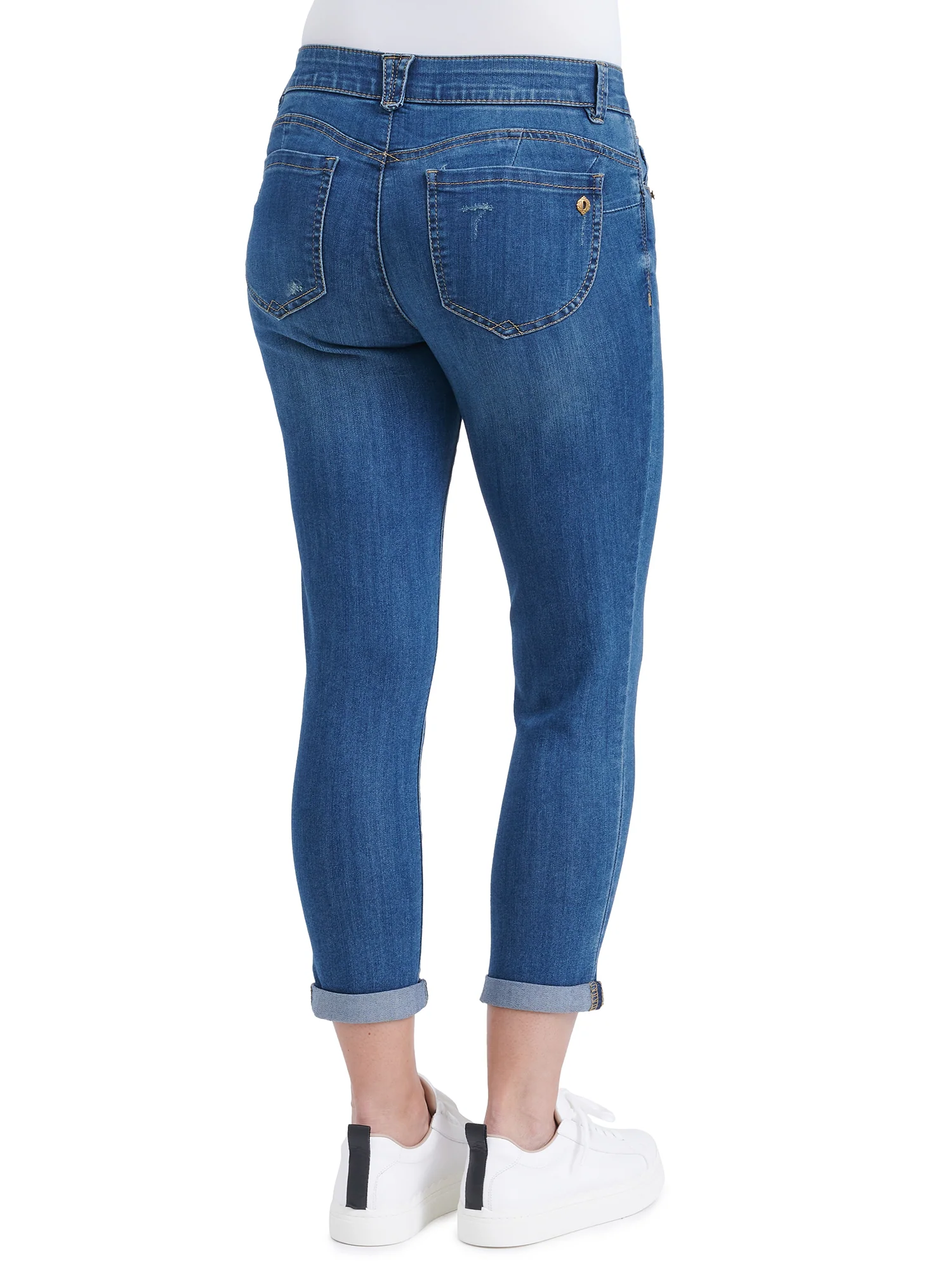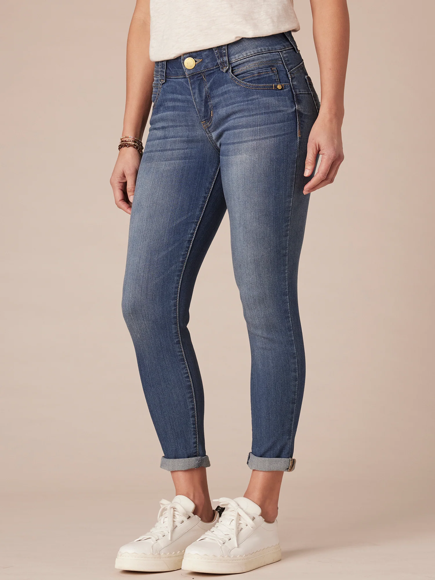 Sure to be a wardrobe favorite, these "Ab"solution Ankle Skimmers in petite sizing offer tummy control with slimming power mesh panels in a blue denim stretch with hand sanding and whiskering. Wear these jeans cuffed at the hem or uncuffed for a more relaxed leg fit. Added "booty lift" included!
