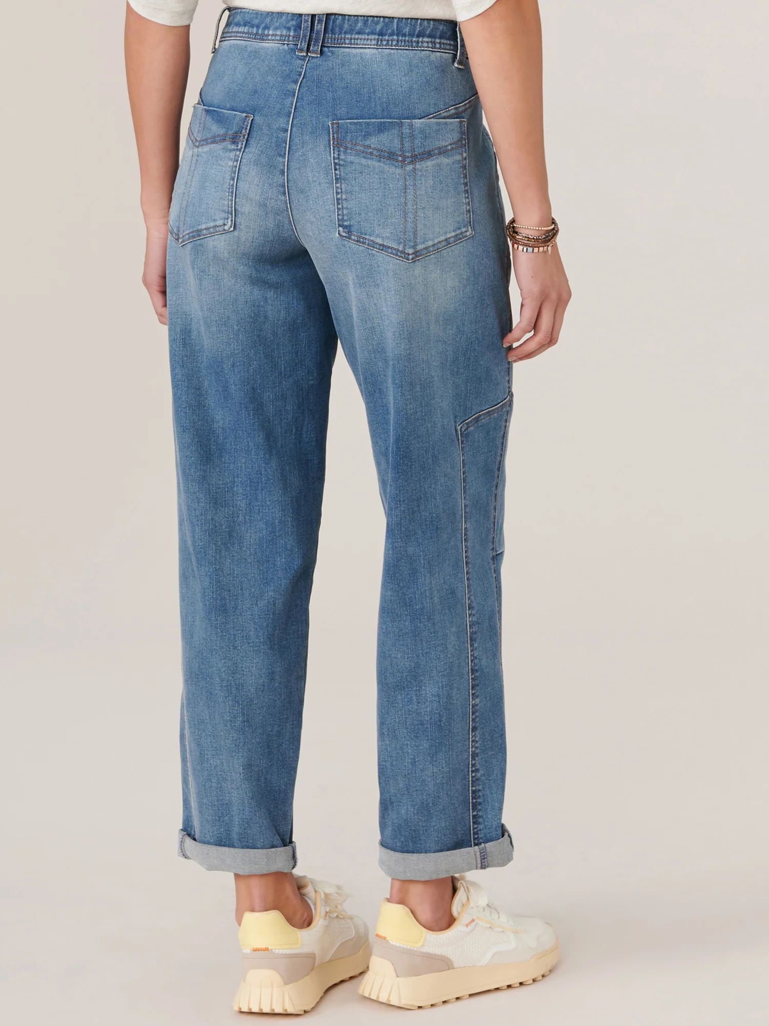 Great denim is all about the details, like side panels, hand sanding and fading, an angled back yoke, and a roll cuff. These high rise Ab solution Barrel Leg jeans in petite sizing have it all, plus our fit technology that molds and holds to your shape and a timeless blue wash.