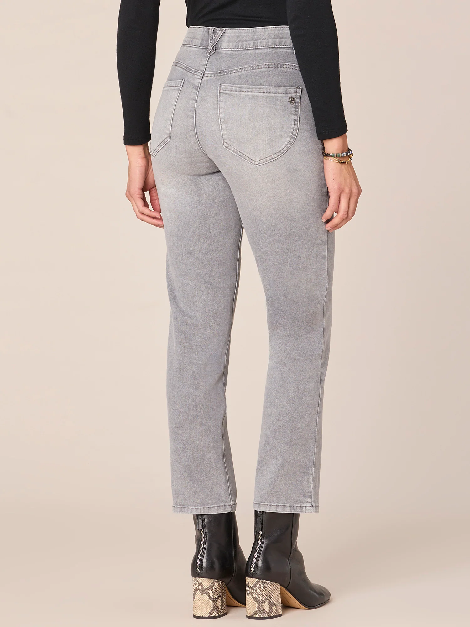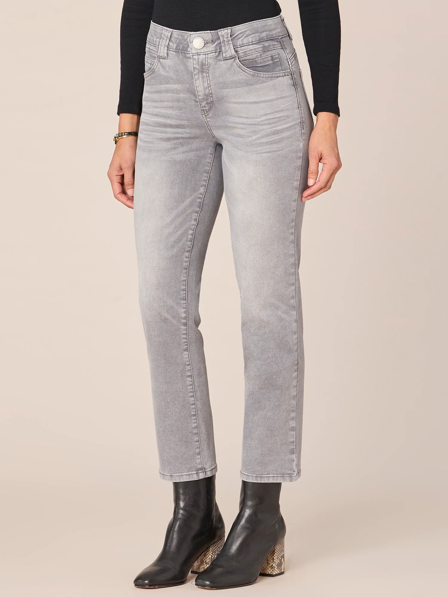 Your latest go-to pair of jeans has arrived. The Ab solution Straight Leg silhouette in a grey artisanal wash is a timeless classic that pairs perfectly with all your favorite tops and accessories. They have a mid-rise waist, cropped ankle-hitting hem, and our signature fit technology, including a hidden elastic no gap waistband and a asset-boosting sweetheart shaped back yoke.