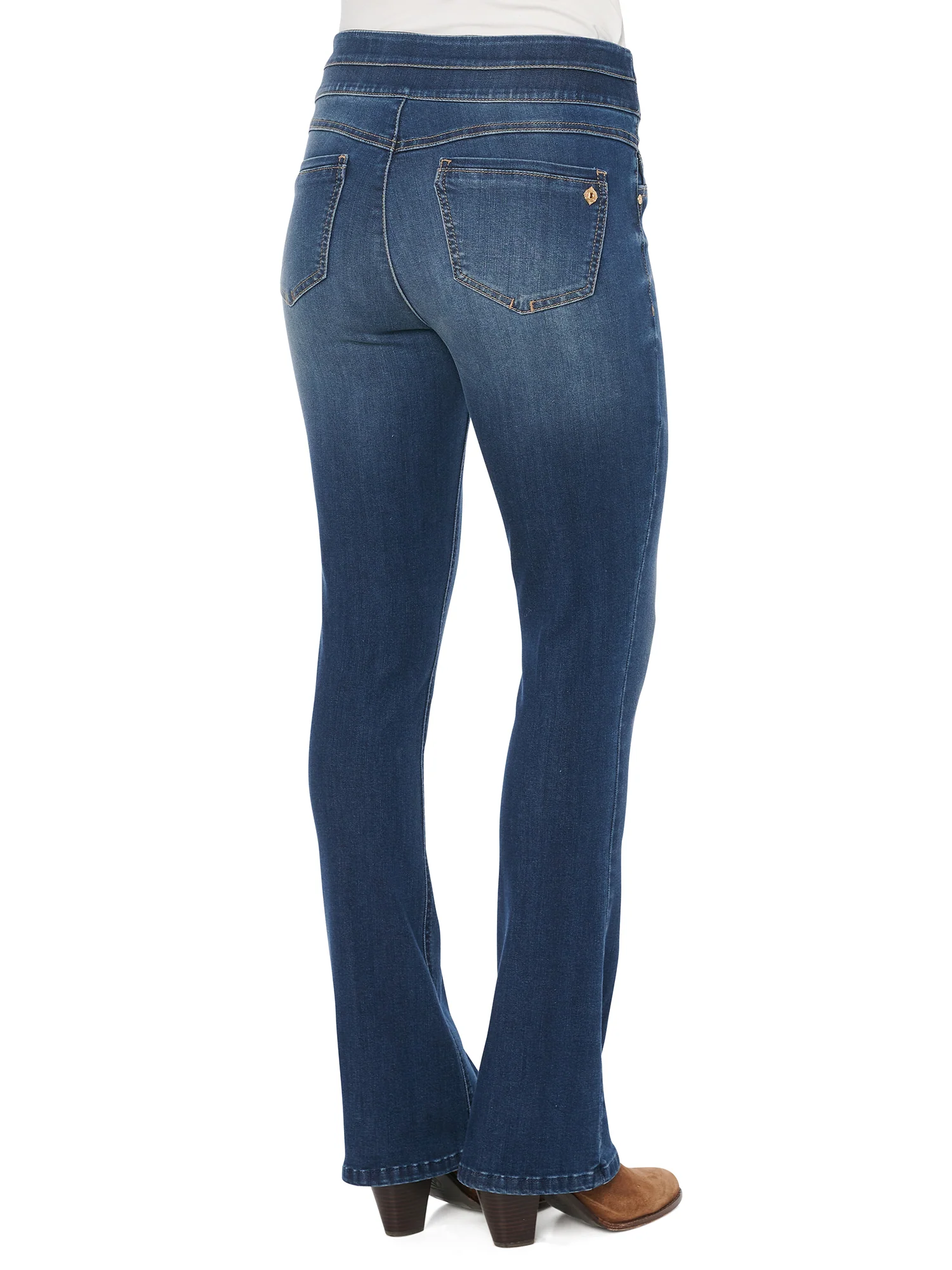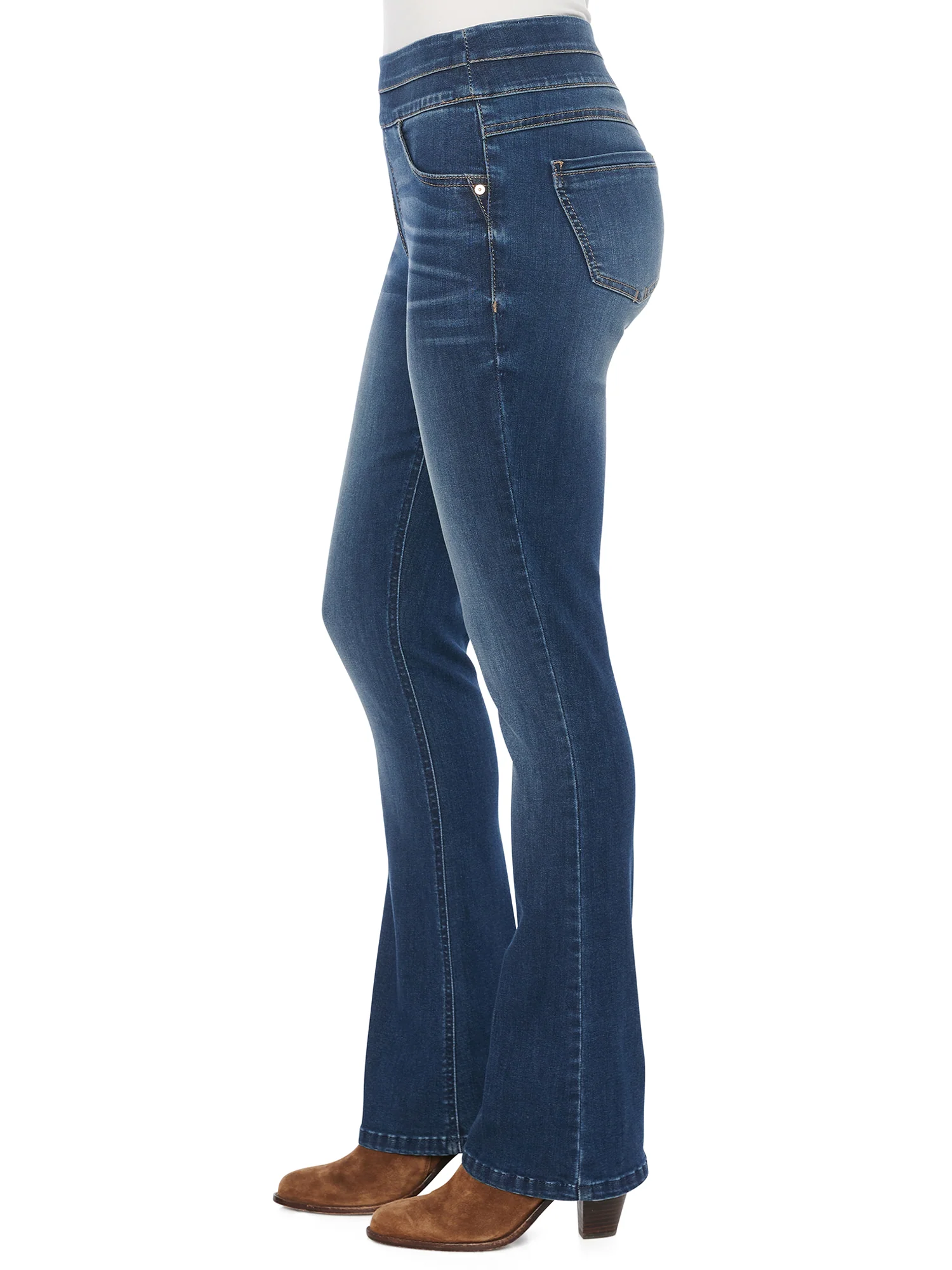 Slip into comfort and style with these high-rise "Ab"solution itty bitty boot jeans in a chic blue wash and petite sizing. Thanks to the extra-wide stretchy pull-on waistband with built-in mesh panels, they comfortably smooth, mold, and hold in all the right places. The hand sanding and whiskering give a desired lived-in look.