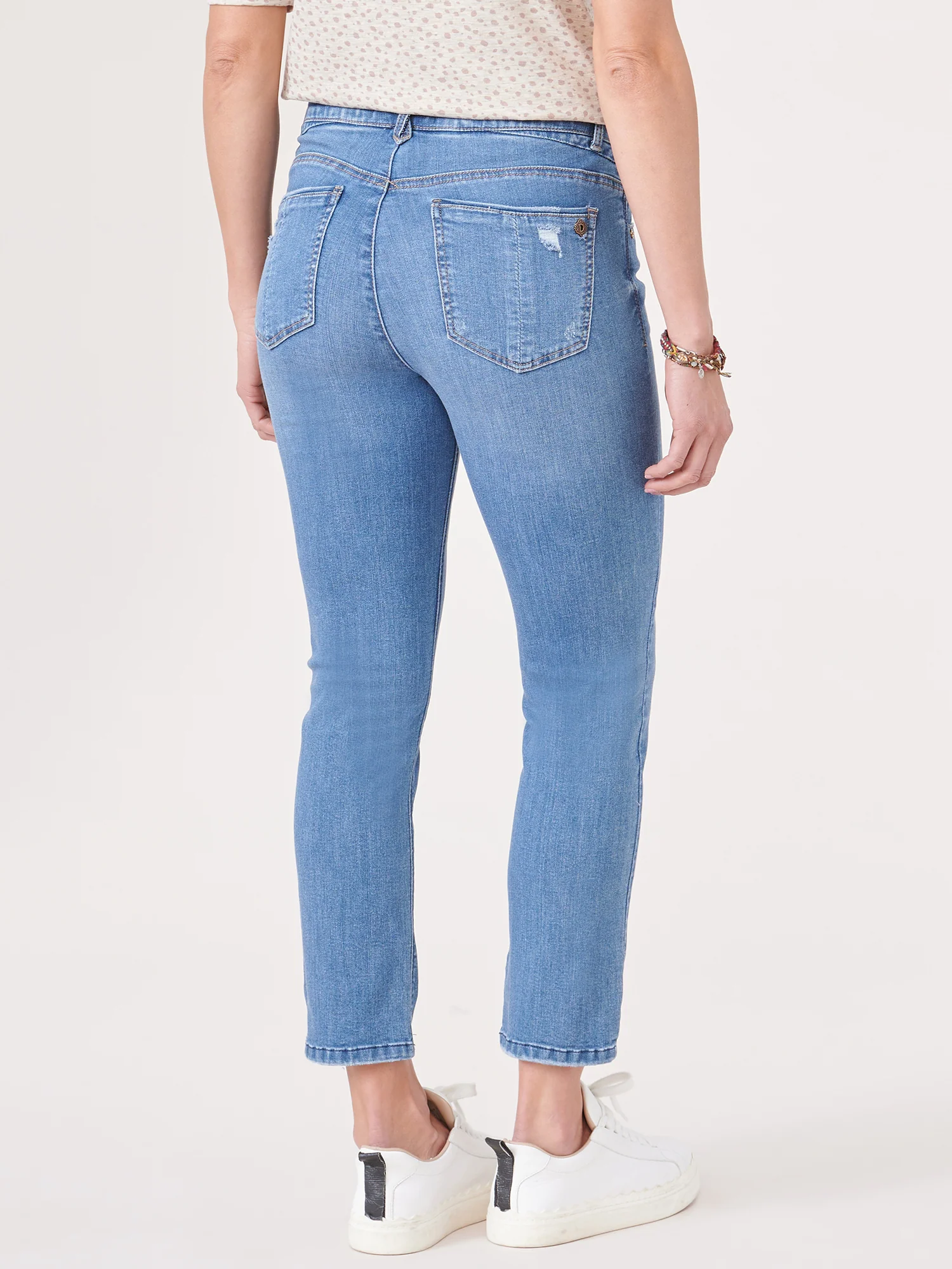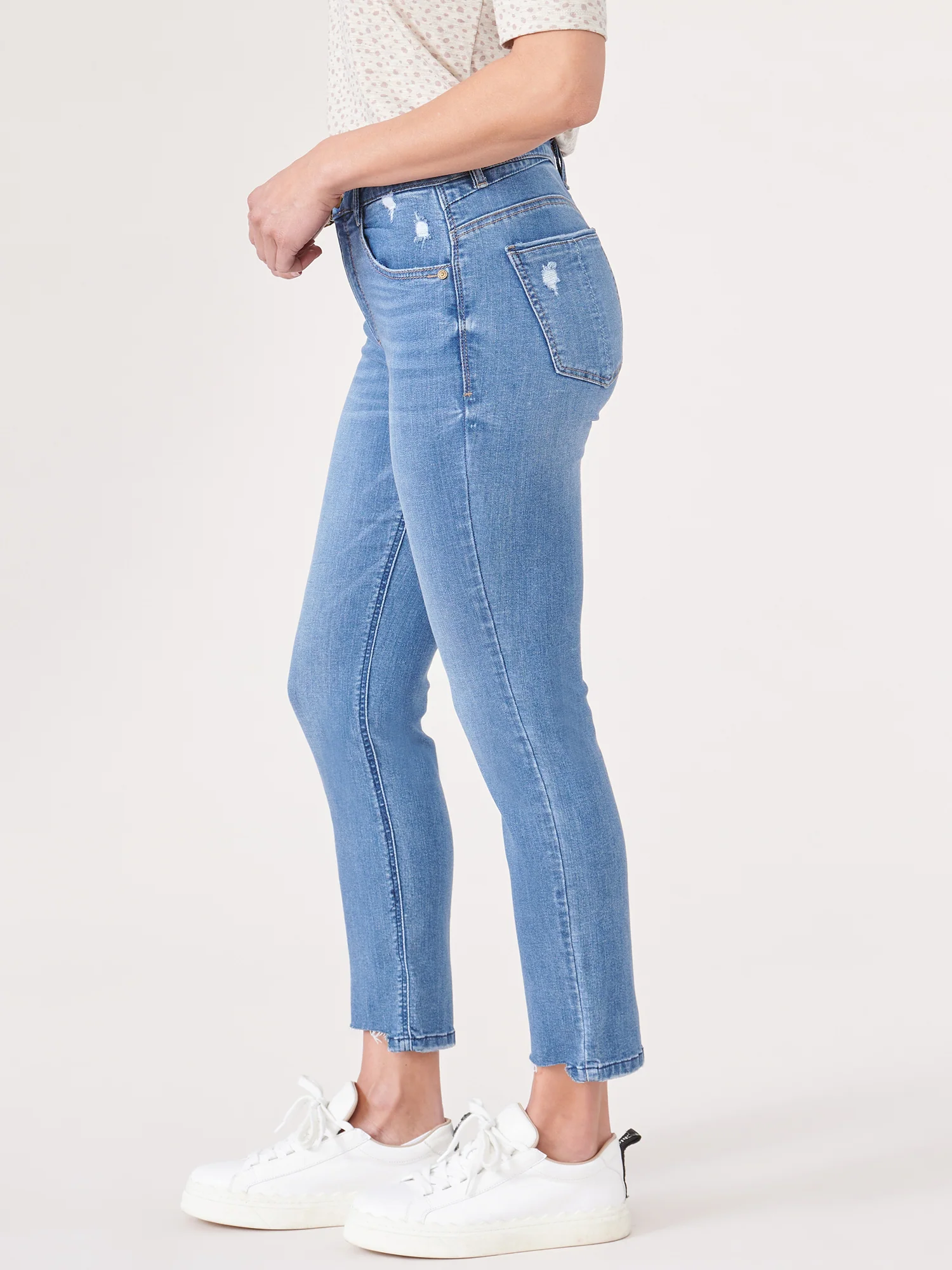 Add an edge to your look with these high-rise slim straight jeans crafted from a stretchy mid blue vintage wash denim with hand sanding, subtle destruction and a destroyed cutout hem. Designed with our always-flattering "Ab"solution fit technology that prevents unwanted gapping with a hidden no-gap elastic waistband and smooths your tummy with interior power mesh panels.