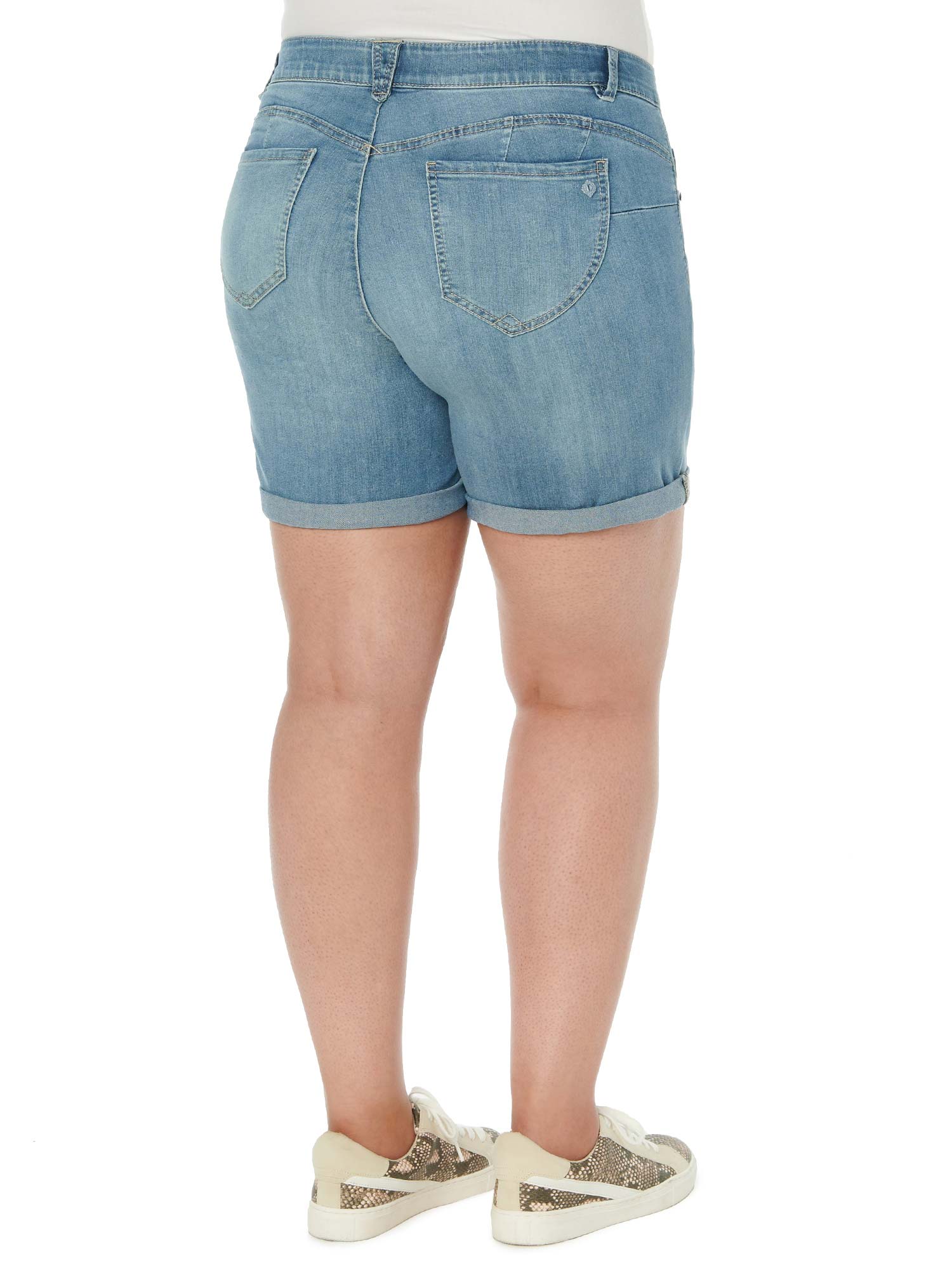 Get ready for the sunshine with these plus-size "Ab"solution light blue wash denim shorts featuring stretchy 2% spandex, hidden no-gap elastic waistband to prevent gapping, and interior slimming power mesh panels. Extra booty-lift fit included!